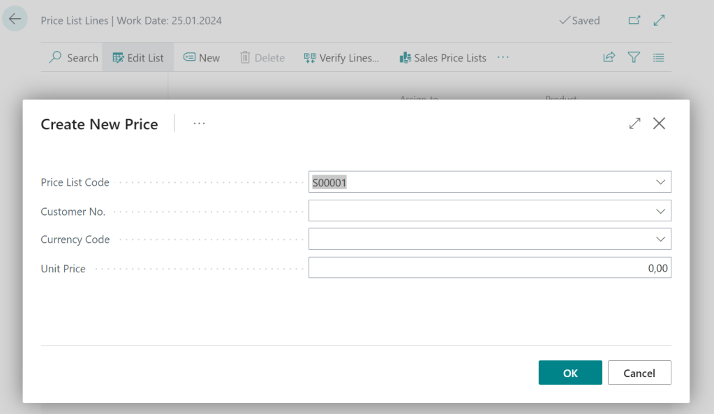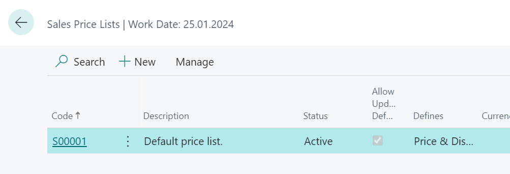 - For a new item the prices do not exist. Therefore we have to open the sales price list. action “Sales Price Lists” – 1 click