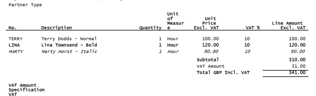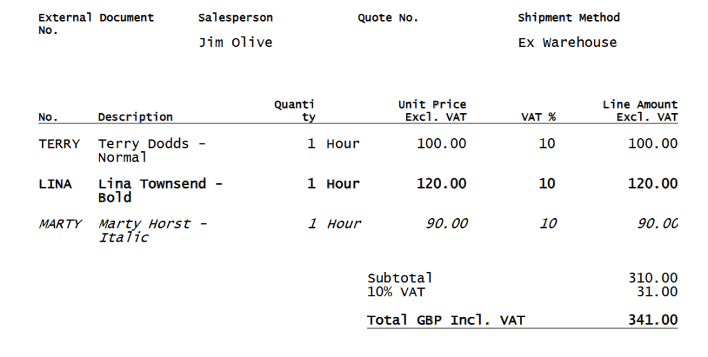 The idea is also quote simple. The repeater will be printed out only if there are lines in a dataitem for which the repeater has been created for. I am therefore exploiting the fact that a repeater can be conditionally printed out. With this principle other conditional printouts can be achieved and we used it for few apps on the AppSource: DYCE Apps. If you want do achieve something fast, just ask the lazy guy – that is me. Here is the Word printout: