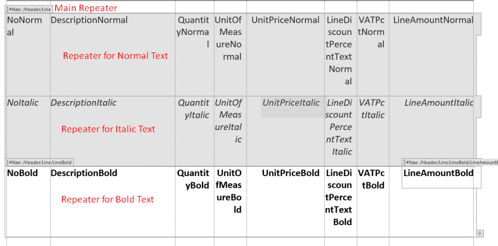 All three dataitems are having the same fields just named differently. Therefore, the downsides are obvious: Dataset size increase and redundance. Now let’s focus on the word layout. It has to have a top-level repeater for Line dataitem and then three nested repeaters inside of a top-level repeater. Not sure if this is clear enough but I can try with a picture.