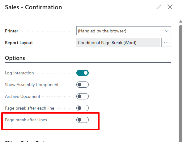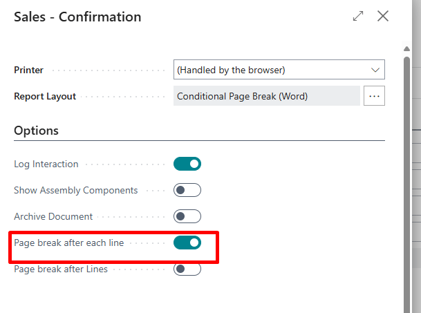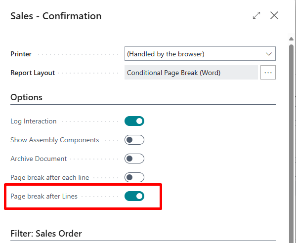 What I have met so far most often is a requirement to put some of the document lines on a new page or to put some of the report parts after lines on a new page. Let’s start with deciding dynamically if some Text in the footer should be always displayed on a new page as this is I would say the easier scenario. I will first add a new checkbox on a report extension that extends the sales Order Confirmation: