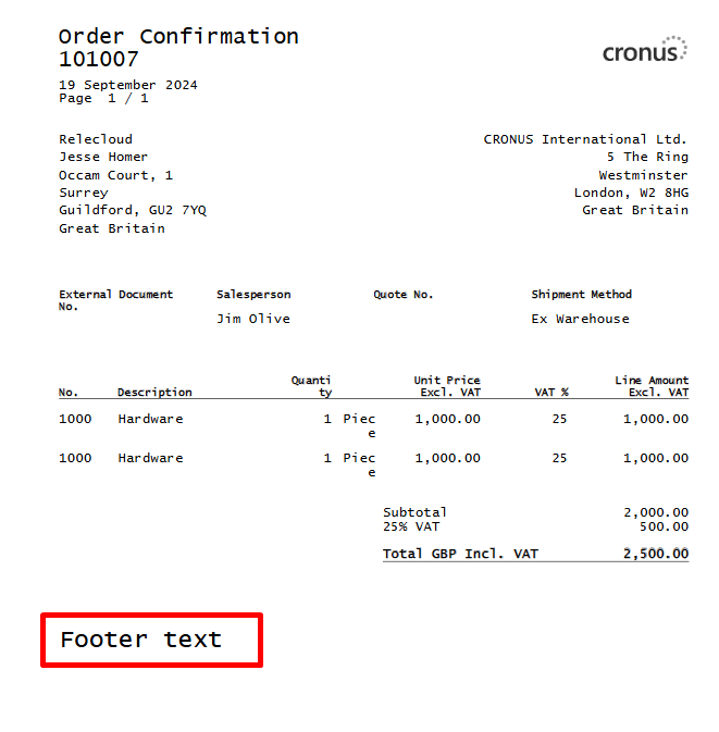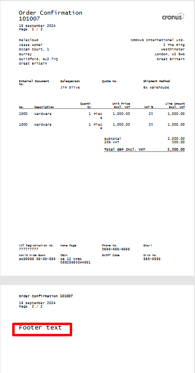 Without the checkbox being set we can observe some Footer Text on a document that I have added in order to demonstrate the part I would like to move to the second page: