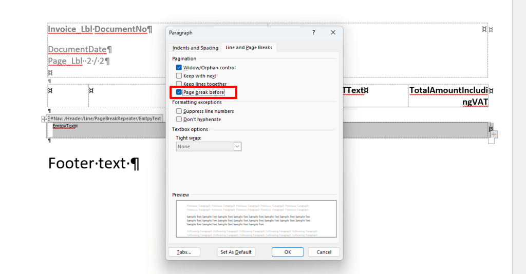 From time to time, I receive a question if the conditional page break is possible in Business Central when Word Layout is used for a report. And there is a nice German word for this type of answer: Jein. In English: yes and no. That in my book means that in order to achieve somewhat desired result we need to reach for some wizardry stuff which is considered a hack.