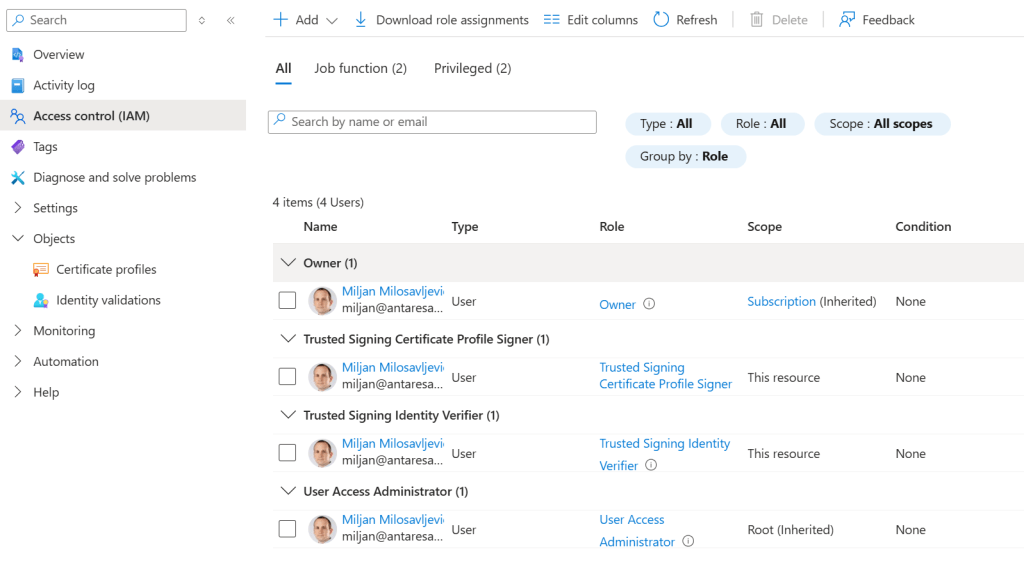 After a Trusted Signing Account has been created, we have to assign two roles: