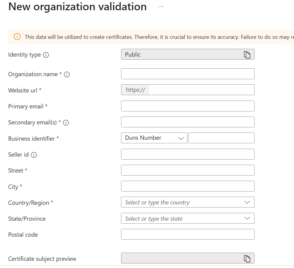 After identity is validated, a next step is to Create a certificate profile. I used the Public Trust. In the form there are only few fields to enter: