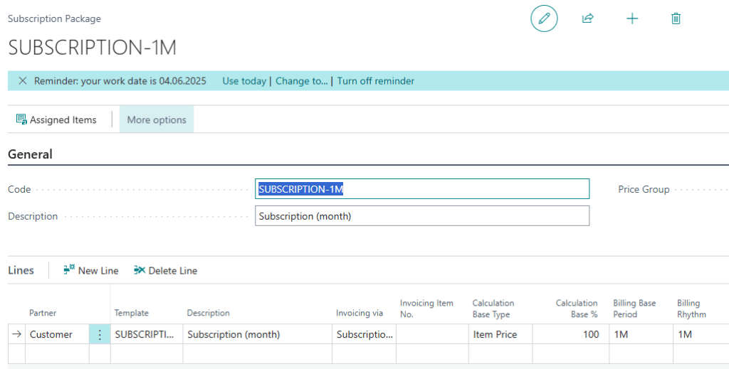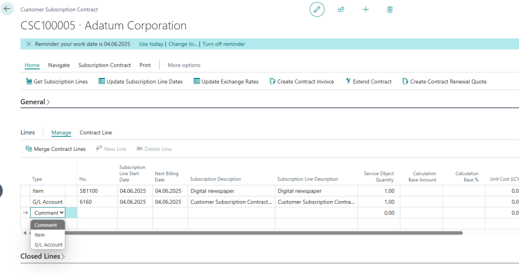 - Previously, in BC25, contract lines could not be created directly. Users had to create a Subscription with lines first and then fetch them into the contract.