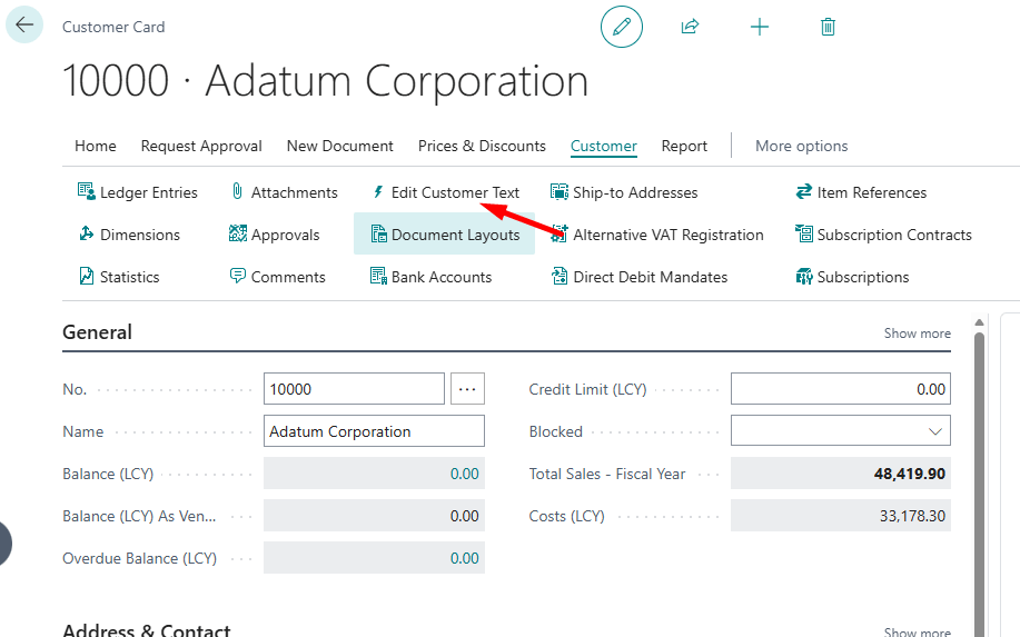 On the Customer Card, there is also an Edit Customer Text action in the Customer tab ribbon: