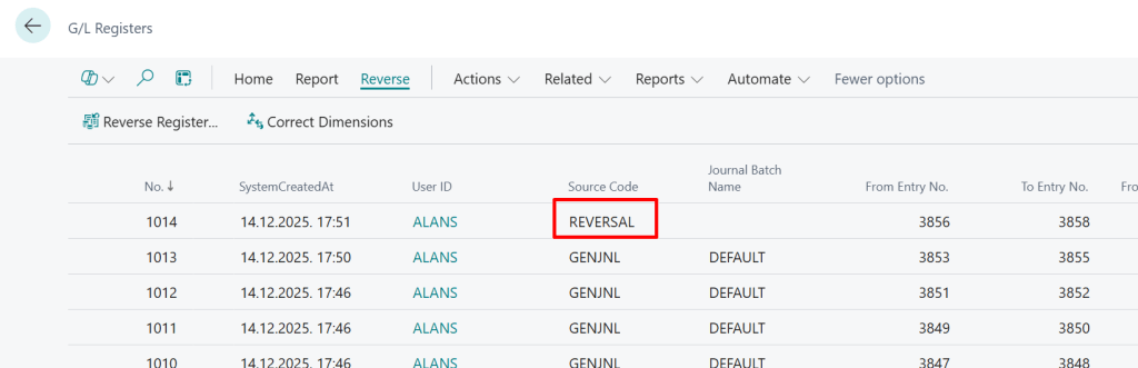 - You’ll see a new line in the G/L Registers page with the Source Code marked as REVERSAL.