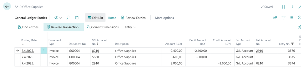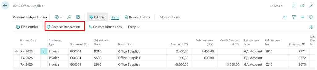- Confirm the reversal. Business Central will automatically create balancing entries for all the original entries.