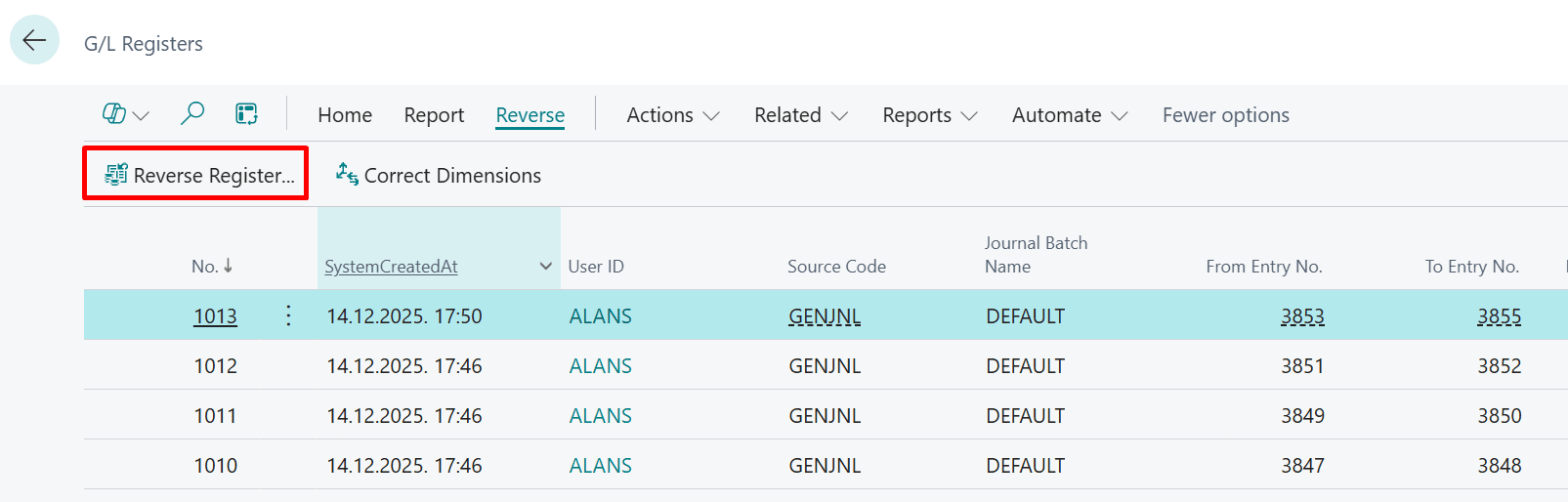 - Confirm the reversal. Business Central will create balancing entries, just like with the register reversal.